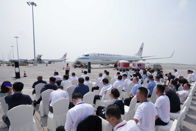8月25日上午,吉隆坡-鄭州鮮食榴蓮首航接機(jī)儀式在鄭州機(jī)場舉行,馬來西亞首批鮮食榴蓮進(jìn)入中國市場,中馬航空貨運(yùn)樞紐項(xiàng)目加速推進(jìn)。中豫航空集團(tuán)黨委書記、董事長張明超,總經(jīng)理、黨委副書記、副董事長柳建民;馬來西亞駐華大使館工作人員,馬來西亞榴蓮廠商公會代表和榴蓮貿(mào)易供應(yīng)鏈企業(yè)代表參加了儀式。